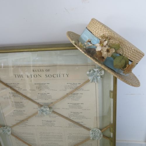 vintage glazed shadow box display containg Eton Soc. Rules with canes etc