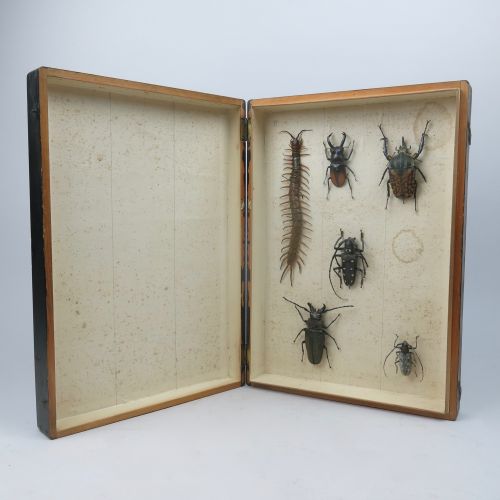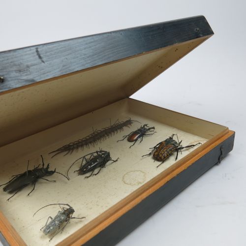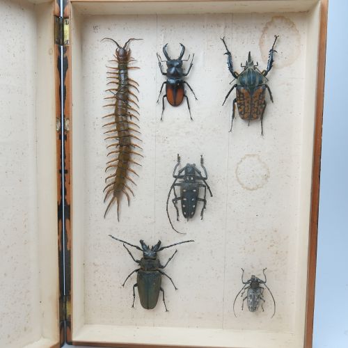vintage collector’s specimen box, hinged lid,containing giant centipede and beetles