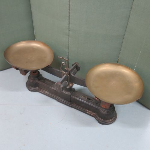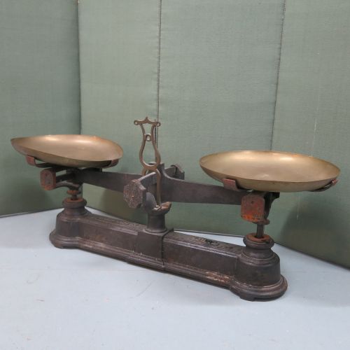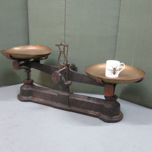 antique/vintage cast iron with brass pans38"l x 17"h (pans 13" dia)standard size mug for reference (picture 3)